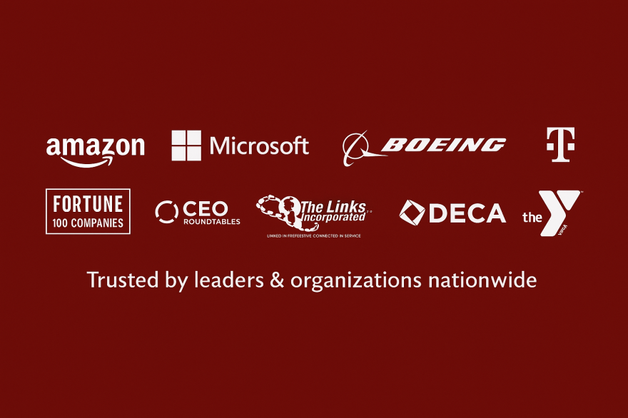 Trusted by leaders and organizations nationwide —including Fortune 100 companies, CEO Roundtables, The Links, DECA, FBLA, YMCA, Boeing, Microsoft, T-Mobile, and Amazon.